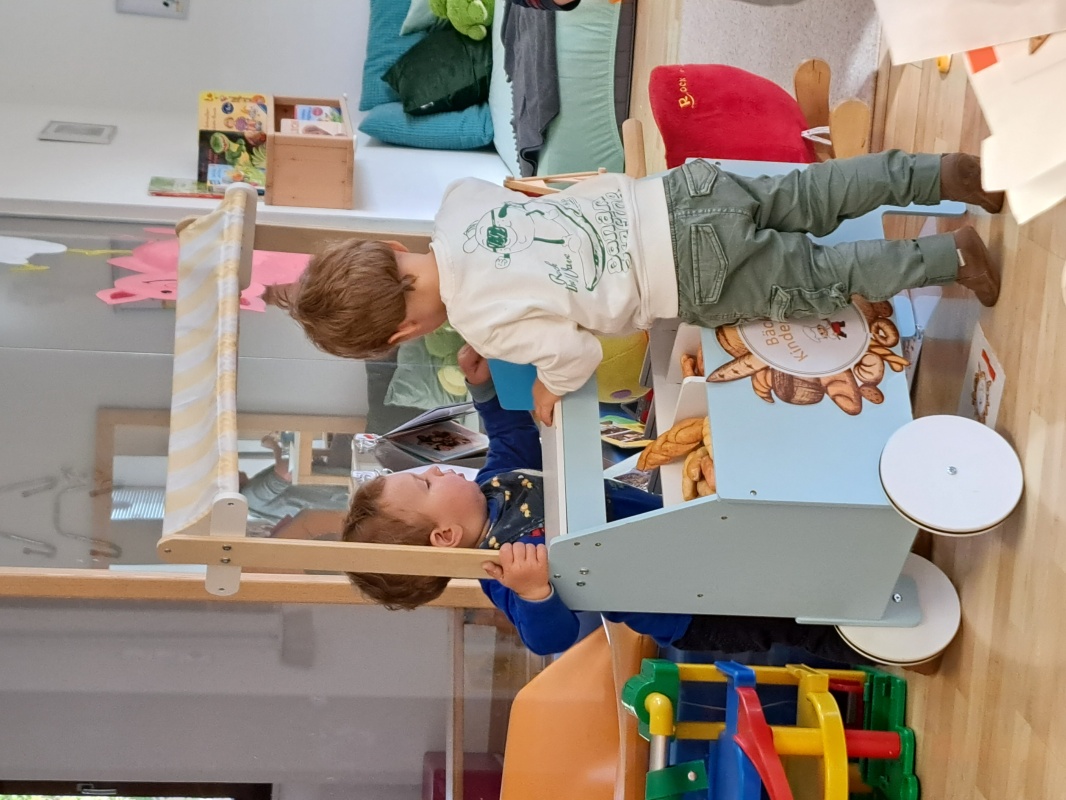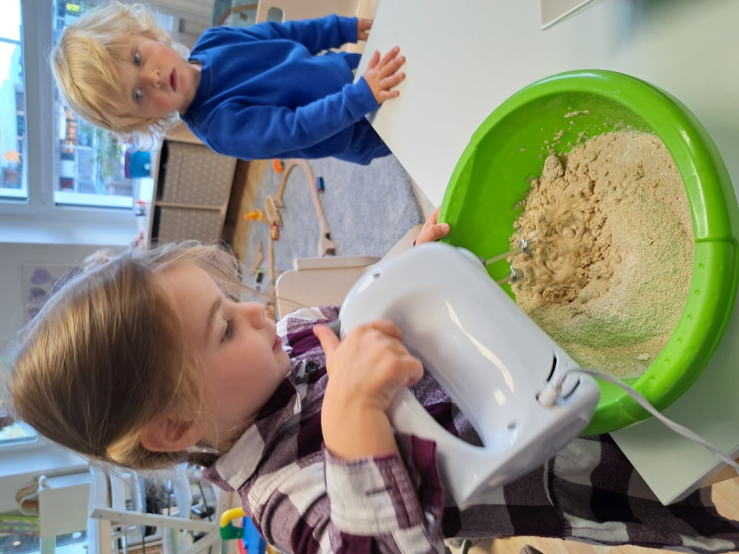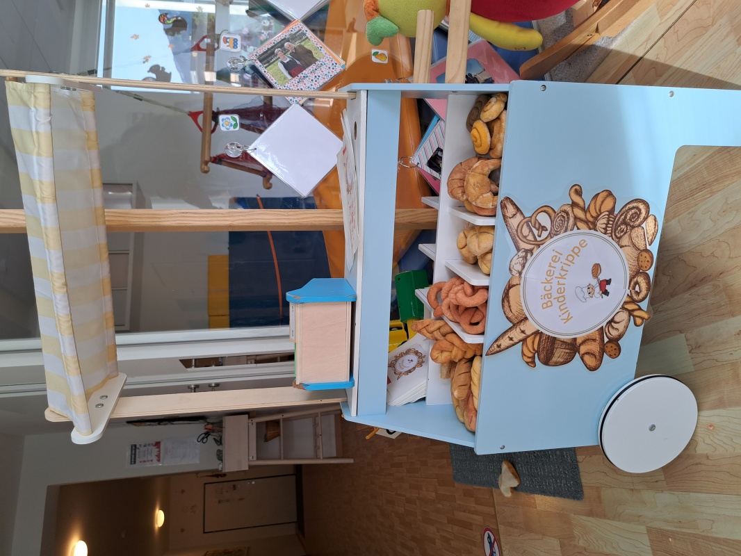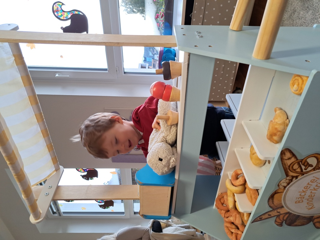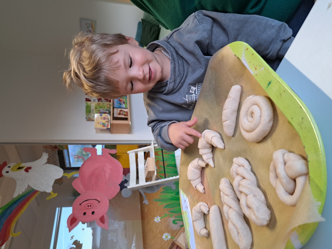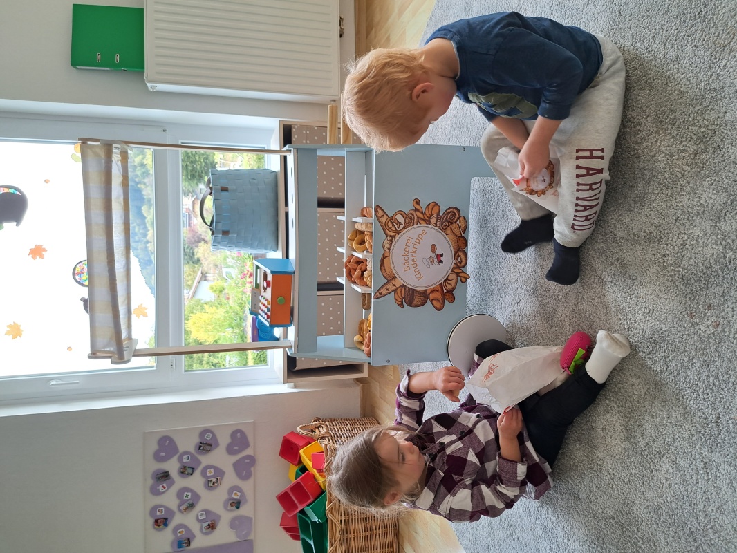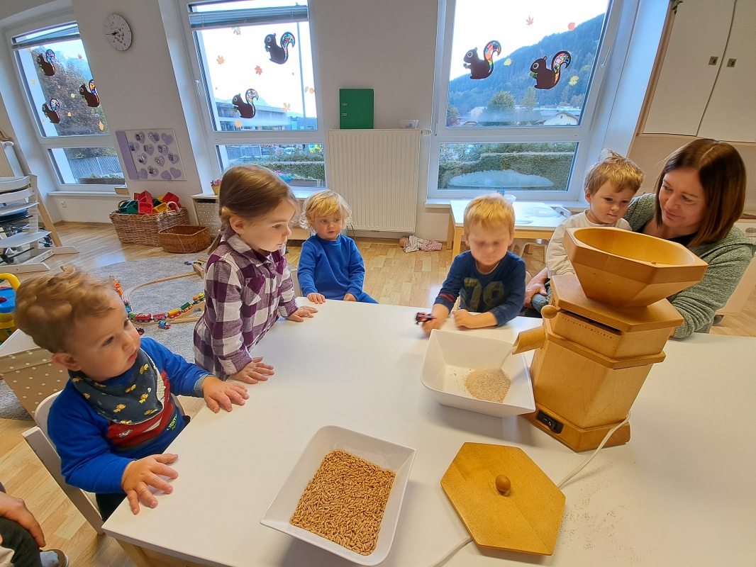 Aus einem Interesse der Kinder heraus, starteten wir das Projekt „Bäckerei“ in unserer Gruppe. Gemeinsam gingen wir der Frage auf den Grund, welche Zutaten wir für ein selbstgemachtes Brot brauchen. Und so mahlten wir mit einer Getreidemühle unser eigenes Mehl und stellten daraus Weckerl für die Jause her. Da diese schnell verputzt waren, kamen wir auf eine super Idee. Wir richten unseren eigenen Bäckereistand zum Spielen ein. Aus Salzteig und Farbe stellten die Kinder eigenes Gebäck her. Selbst gestaltete Brotsackerl sowie eine Kassa durften ebenso nicht fehlen. Die Kinder haben riesigen Spaß beim Einkaufen und Verkaufen.