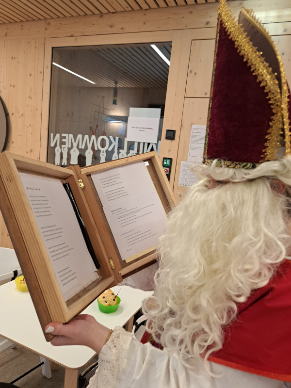 Die Kinder hatten sich im Vorfeld gut vorbereitet und überraschten den Nikolaus mit einem fröhlichen Lied, das sie mit viel Begeisterung sangen. Der Nikolaus freute sich sehr über die Darbietung und lobte die Kinder für ihren Mut und ihre tollen Stimmen.